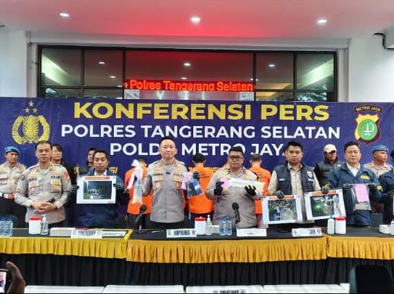 Dalam konferensi pers di halaman Polres Tangerang Selatan, Jalan Promoter No. 1, Serpong, hadir Wakapolres, Kapolsek Curug, Kasat Reskrim, dan Kasi Humas. Kegiatan dipimpin Kapolres AKBP Victor D.H. Inkiriwang.