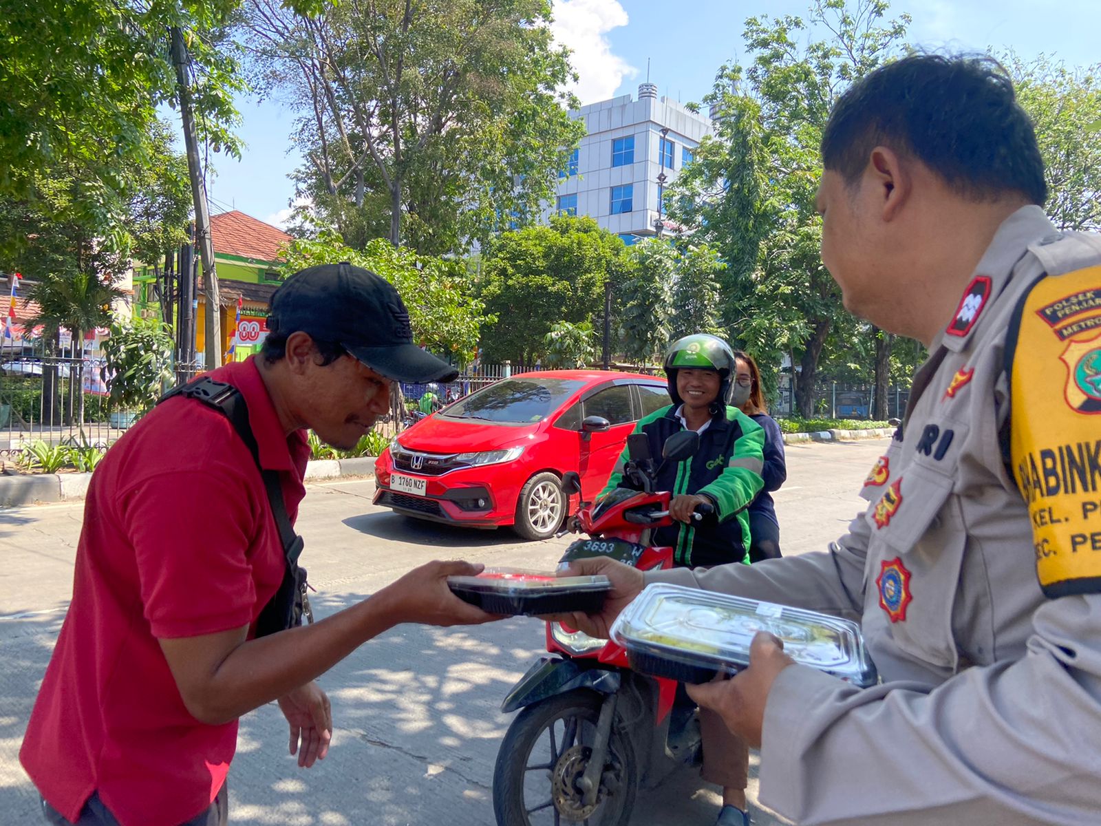 Ratusan paket nasi kotak dibagikan kepada warga yang melintas, mulai dari tukang sampah, pengemudi ojek online, hingga sopir angkutan umum. Selain berbagi makanan, polisi juga menyampaikan pesan-pesan keamanan dan perdamaian masyarakat (Kamtibmas).