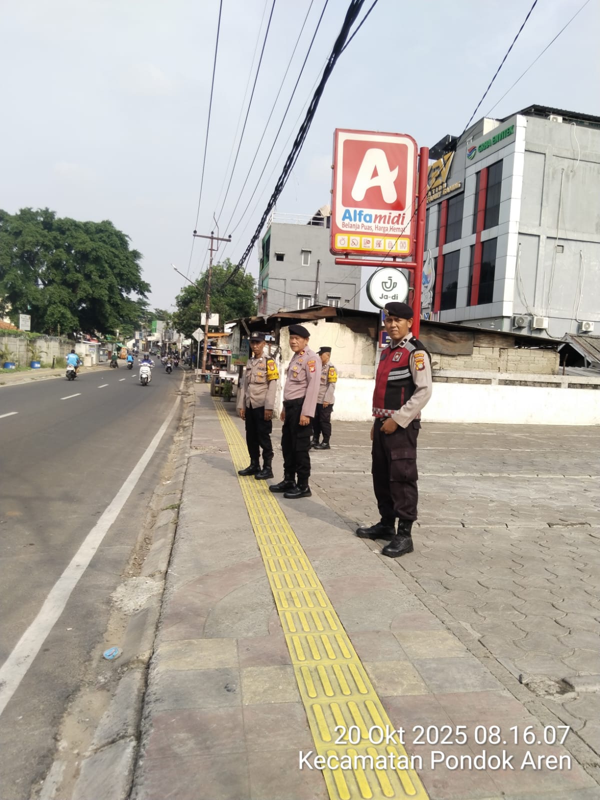 Kegiatan dipimpin oleh IPTU Rohmani (Kanit Patroli) bersama AIPTU Soleh, AIPDA Junaydi, AIPTU Syamsudin, dan AIPDA Salleh Assaman. Petugas ditempatkan di sekitar Alfamidi, seberang BMKG, Kelurahan Pondok Betung, Kecamatan Pondok Aren, Kota Tangerang Selatan, guna memastikan situasi lalu lintas aman dan terkendali.