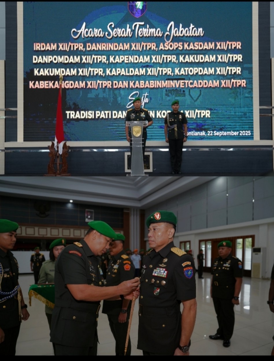 KUBU RAYA MEDIAKOTA.com– Dalam rangka pembinaan organisasi dan proses regenerasi kepemimpinan, Pangdam XII/Tanjungpura, Mayjen TNI Jamallulael, S.Sos., M.Si., memimpin Serah Terima Jabatan (Sertijab) Irdam XII/Tpr dan sejumlah pejabat strategis lainnya di lingkungan jajaran Kodam XII/Tpr. Di Aula Sudirman, Makodam XII/Tpr, Senin (22/9/2025).