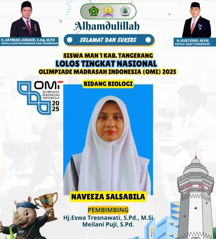 Salah satu prestasi yang membanggakan adalah siswa MAN 1 Tangerang Banten Naveeza Salsabila yang berhasil lolos melaju ke tingkat Nasional pada ajang Olimpiade Madrasah Indonesia (OMI) 2025 untuk bidang Biologi.